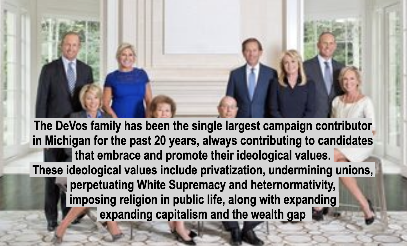 Adding all of those campaign contributions to just these candidates/ballot initiatives, comes to a total of $823,208 for the most recent quarter of campaign finance reports. While this is a substantial amount of money, we know that this will increased significantly before the November Election. GRIID will continue to track this information and demonstrate once again that the politics of the DeVos family is far right, supporting candidates and initiatives that hurt BIPOC people, working people, people who identify as LGBTQ, immigrants and other marginalized communities.