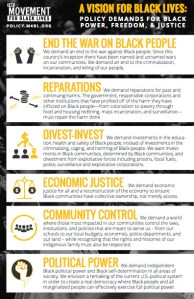In addition to these essays, we read and discussed the Movement for Black Lives vision document that was developed in 2015. This document provides a robust set of demands, with powerful vision, as can be viewed in the graphic here on the right.
