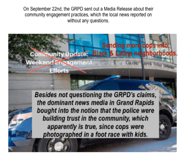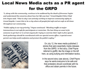 For several months after the May 30th, 2020 uprising, GRIID documented how Grand Rapids City Officials and Chief Payne attempted to control the narrative about policing in Grand Rapids. One of the points we made in that documentation was the fact that the local news media often acts as a Public Relation arms of the GRPD. In fact, we have documented on numerous instances that the local news media has simply repeated GRPD Media Releases as fact, without seeking input or a counter perspective from the numerous groups demanding more accountability from the Police Department.