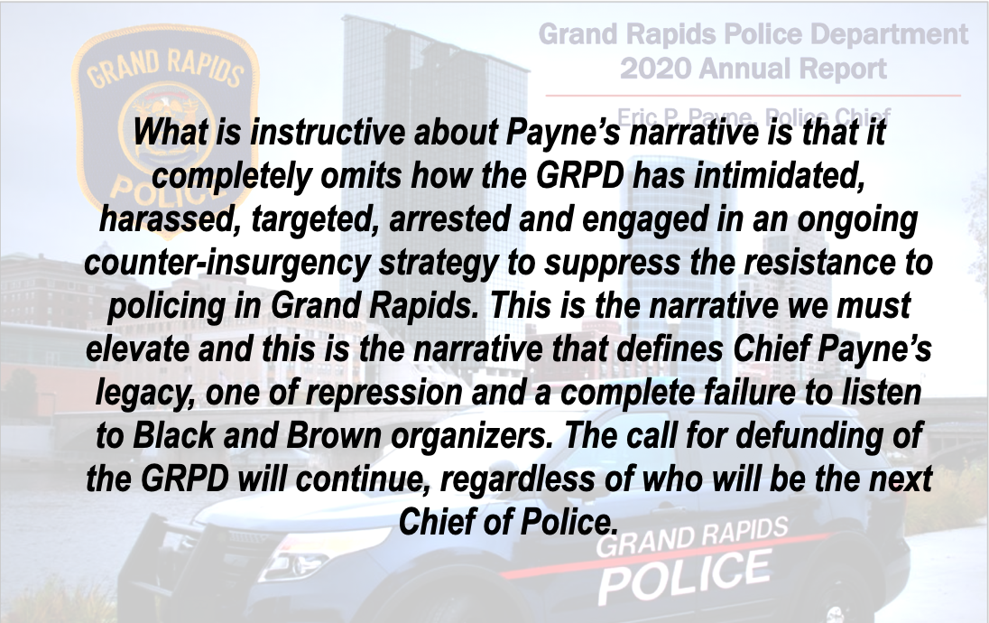First, Payne was NOT always willing to listen to people calling for reforms. Numerous community-based groups and a larger movement pushing for defunding the GRPD were repeatedly ignored over the past several years. Groups like Movimiento Cosecha GR and GR Rapid Response to ICE were making demands on GRPD collaboration and complicity with Immigration and Customs Enforcement (ICE). Those demands were ignored. Groups like Defund the GRPD, Justice for Black Lives, the Urban Core Collective, the ACLU, the NAACP and Linc Up were also calling for more structural changes to the GRPD, which were also ignored.