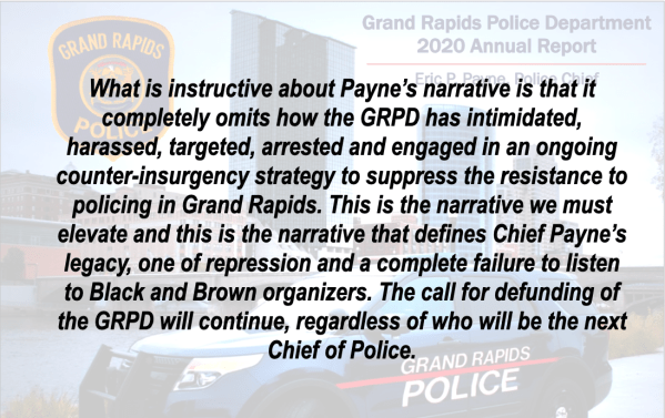 The MLive article on the retirement of Chief Payne also omitted the fact that through significant community pressure, Grand Rapids City officials decided to not use COVID relief funding that was being offered through Kent County to purchase the ShotSpotter technology for the GRPD.