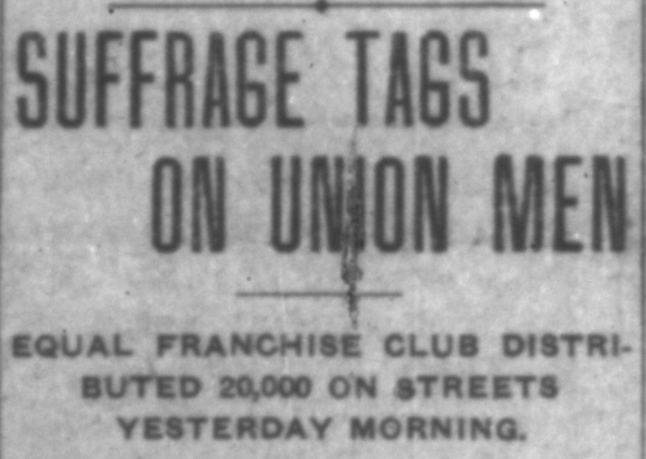 The Equal Franchise Club did indeed participate in the 1912 Labor Day parade, with a a float, that was fully decorated, with a banner that hung from the side, which said, “A Square Deal,” advocating fair wages for workers. In addition, about 40 women involved in the Suffrage Movement, handed out 20,000 tags to those in attendance, with one side saying “Votes for Women” and the other side with the same message as the banner on the float. The newspaper reported. “The suffragists met with a most encouraging reception from the men.”