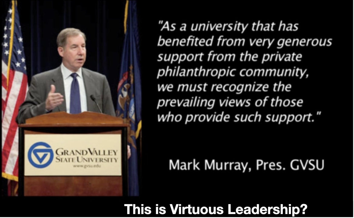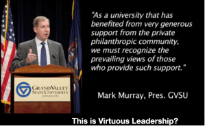 A second example of Murray practicing Virtuous Leadership, was when he was the President of Grand Valley State University (GVSU). GVSU tried to pass a domestic partner benefits policy in 1995, but was prevented from doing so by Wealthy donors – DeVos & Cook – who threatened to withhold their money from a proposed building project.