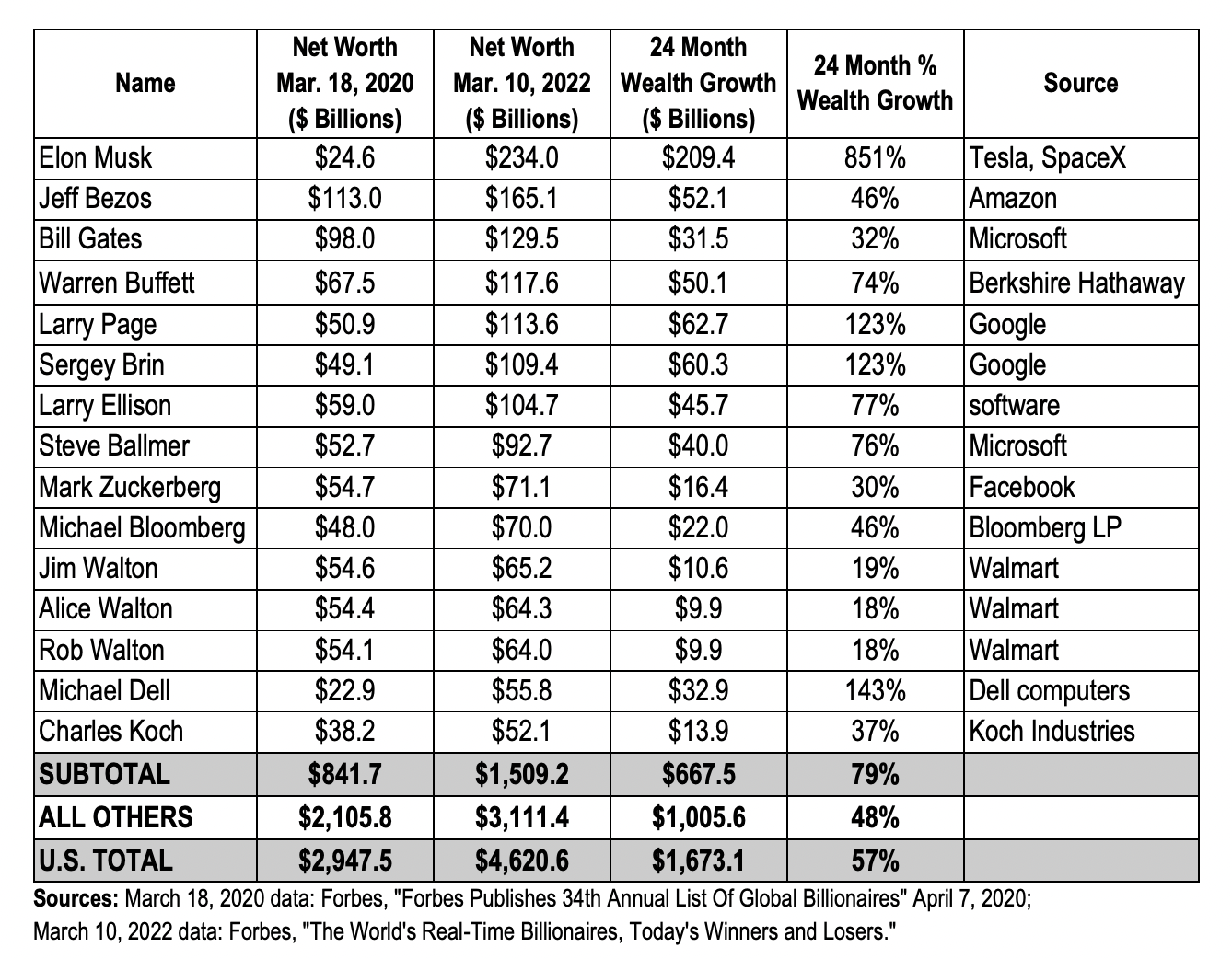 - The $1.7 trillion wealth gain by billionaires over the past 24 months could fund much of the 10-year $2.2 trillion cost of the Build Back Better plan of social and environmental investments passed by the House of Representatives last fall. Billionaires could pick up much of the tab and still be just as rich as they were before COVID hit.