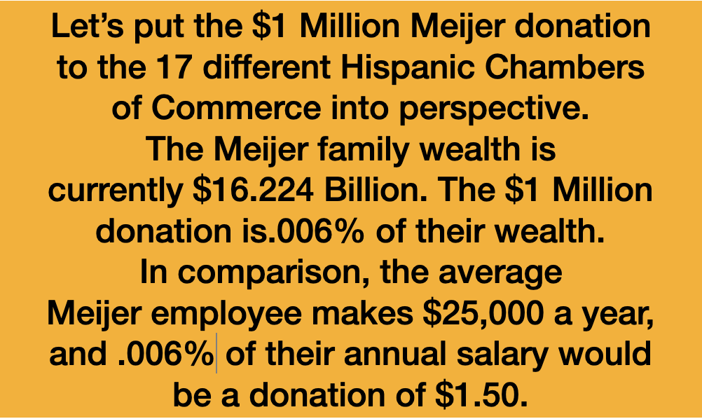 Before we begin discussing the content of this MLive article, it is worth noting that MLive essentially just reposted a version of the Meijer Media Release. Not only is this another example of lazy journalism, it demonstrates a complete lack of inquiry on the part of the MLive reporter. Here are a list of questions that the MLive reporter could have asked, in order to explore the implications of the Meijer donation to various Hispanic Chambers of Commerce.
