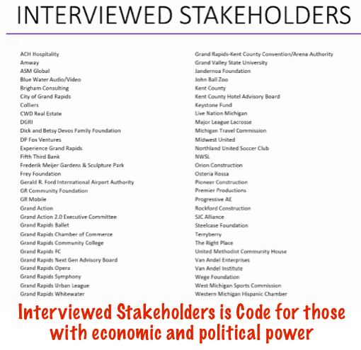 In late November of 2020, Grand Action 2.0 brought in a speaker and consultant to talk about the amphitheater project and other riverfront money making plans as well. One thing that was discussed was the importance of talking with stakeholders. Stakeholders is often code for those who have power and privilege, as is evidenced by the majority of those who were invited to give input in the graphic here.
