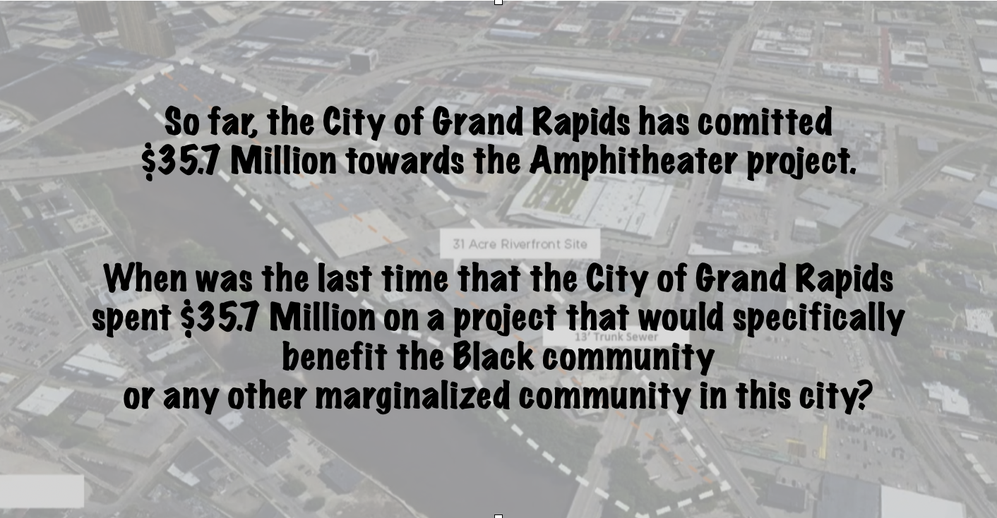 A third point to make here, is to ask the question, when was the last time that the City of Grand Rapids spent $35.7 Million on a project that would specifically benefit the Black community or any other marginalized community in this city? In fact, we could expand this question to include the amount of money that is estimate to be spent on the larger 31 acre riverfront development (includes the amphitheater), which is $500 Million. When was the last time the City of Grand Rapids spent $500 Million to benefit the BIPOC community in this city?