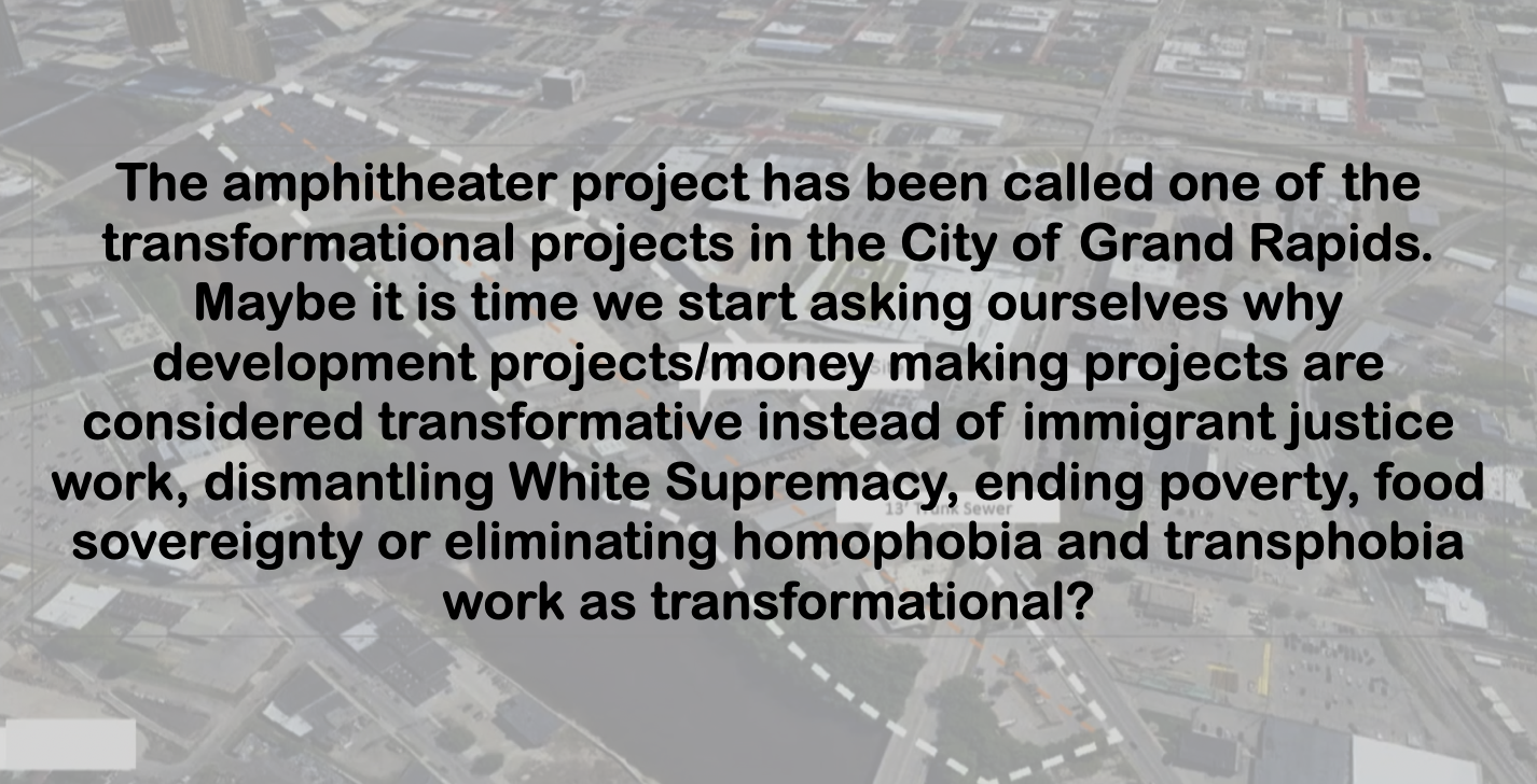 Lastly, the amphitheater project has been called one of the transformational projects in the City of Grand Rapids. Maybe it is time we start asking ourselves why development projects/money making projects are considered transformative instead of immigrant justice work, dismantling White Supremacy, ending poverty, food sovereignty or smashing homophobia and transphobia work as transformational? There is nothing transformational about projects that primarily benefit those who already have the most economic and political pow in this city.