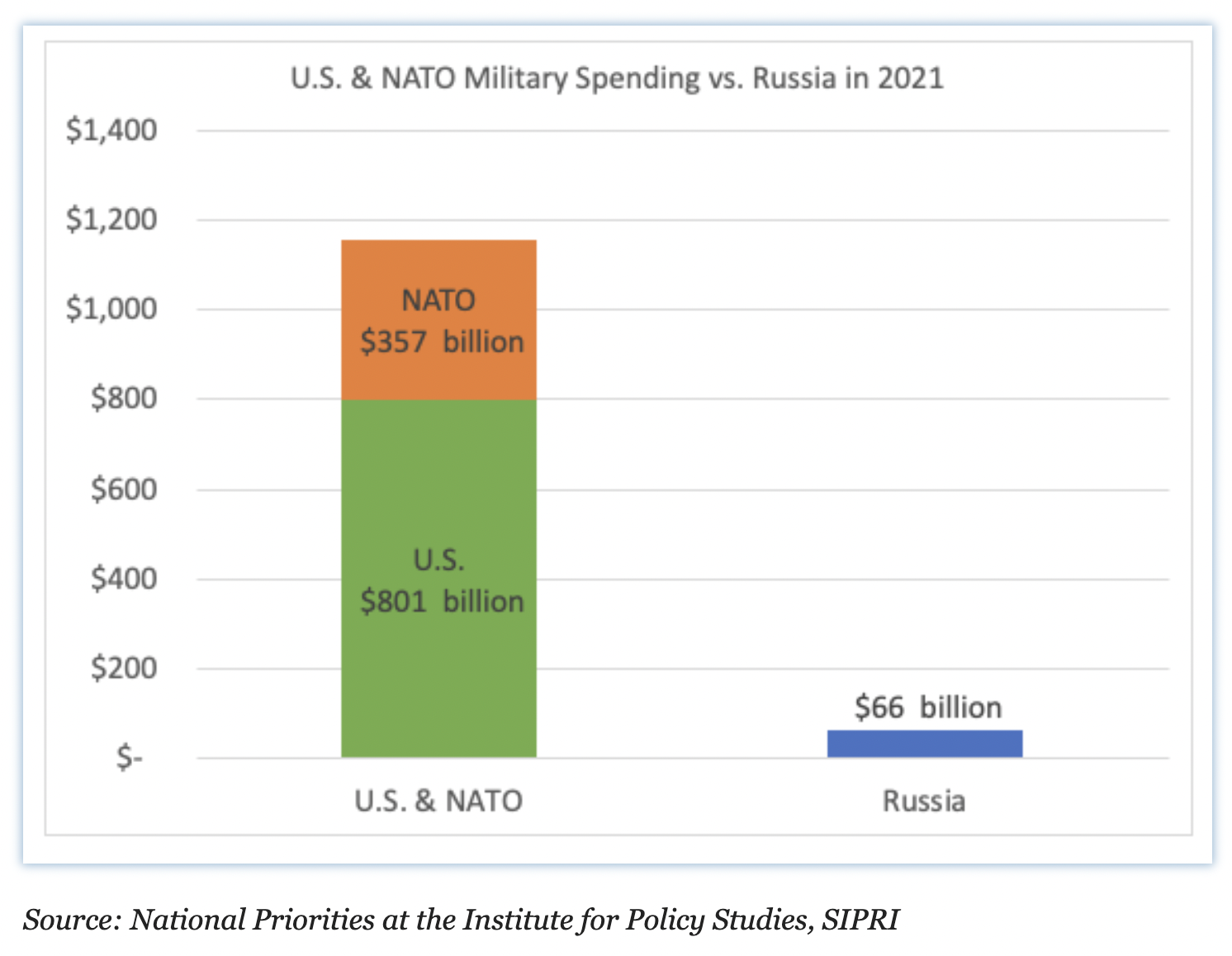 That is to say, that U.S. and NATO military spending totaling nearly $1.2 trillion – more than 17 times as much as Russia spent – failed to dissuade Putin’s aggression toward Ukraine. The U.S. alone spent 12 times as much as Russia.