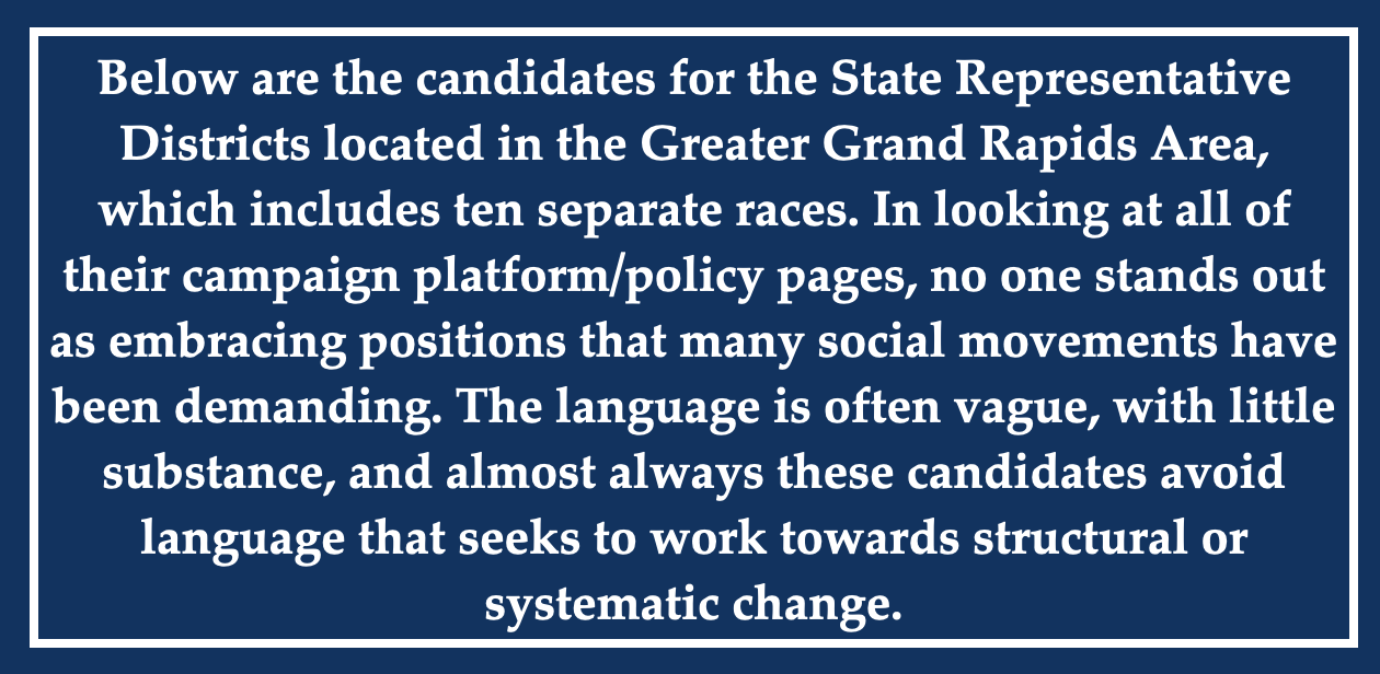 Below are the candidates for the State Representative Districts located in the Greater Grand Rapids Area, which includes ten separate races. In looking at all of their campaign platform/policy pages, no one stands out as embracing positions that many social movements have been demanding. The language is often vague, with little substance, and almost always these candidates avoid language that seeks to work towards structural or systematic change.