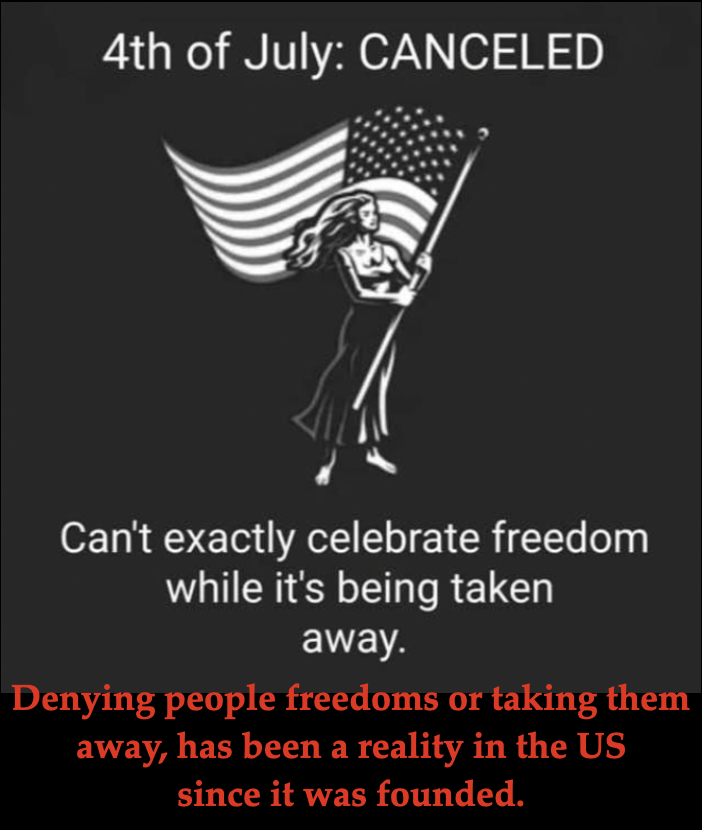 This all sounds nice and makes for great propaganda, but it completely ignores the history of oppression and exclusion that has plagued the US since it was founded. For those pissed off about the Roe v Wade decision, and calling for a Fourth of July boycott, demonstrates not only the level of their white privilege, it demonstrates their ignorance and complicity in crimes this country has committed against so many people. What follows is a brief list of why the Fourth of July could and should always be boycotted: