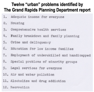 “The residents of the inner city must feel that the local government is their government. This is best shown when their problems and suggestions are considered as seriously as those of others in the community. A reputation for being concerned and doing everything possible for the inner city will go a long way toward the opinion that, unlike most American cities, the government of Grand Rapids considers these people first class citizens.”