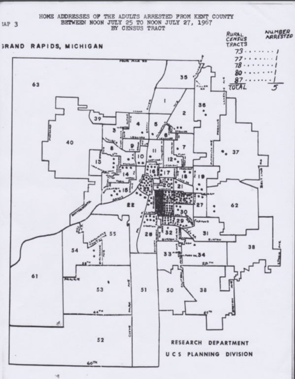 However, there were several white people who were arrested, according to a report published just months after the 1967 riot, entitled, Anatomy of a Riot. According to the report, published by the Grand Rapids Planning Department, most of the white people that were arrested, was because of weapons charges. Apparently, there were several white residents who wanted to use the riot as an opportunity to shoot black people. The report notes that some of the white people arrested were armed because they “wanted to protect their property.”