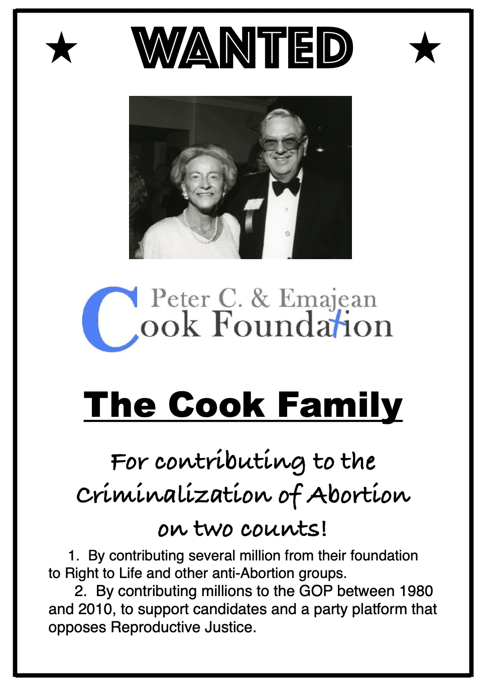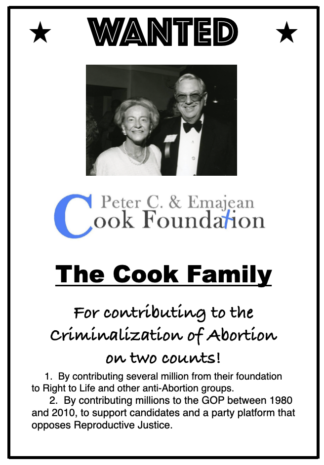 Wanted for funding the criminalization of Abortion: The Cook Family