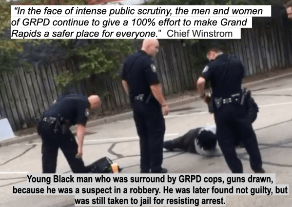 Another aspect of the “new training” with the new policy changes, is that the GRPD will now verbally communicate with suspects that if they do not comply with police commands that they will be given a warning before use of deadly force. Does anyone think that it will be beneficial for those being targeted by the GRPD to know if they do not comply with Police commands that will be told that they will be tased, beaten, have a cop put his knee on their neck, or shoot you in the back of the head? Take a moment to ponder that question.