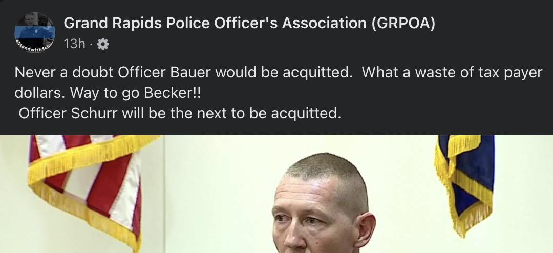 The Grand Rapids Police Officer’s Association (GRPOA) didn’t waste any time responding to the verdict. They posted a link to the WOOD TV 8 story, but provided their own narrative at the top, which read: