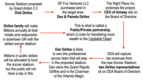 Downtown Grand Rapids has an interesting history, with its origins being Settler Colonialism and the displacement of Indigenous communities. Since then downtown Grand Rapids has been a major hub for those with political and economic power to make and remake that part of the city, regardless of what the public thinks. Downtown Grand Rapids is like a playground for the members of the Capitalist Class, where they get what they want or they’ll throw a temper tantrum. And what they want is to continue to get the public to pay for their playground projects, while they sit back and watch their wealth exponentially increase. We should see the proposed soccer stadium as just the most recent example of the Capitalist Con, with the DeVos family being the primary beneficiaries.