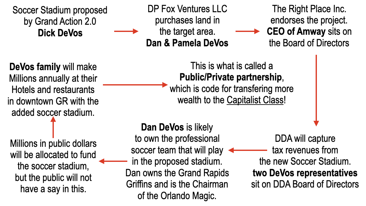 Downtown Grand Rapids has an interesting history, with its origins being Settler Colonialism and the displacement of Indigenous communities. Since then downtown Grand Rapids has been a major hub for those with political and economic power to make and remake that part of the city, regardless of what the public thinks. Downtown Grand Rapids is like a playground for the members of the Capitalist Class, where they get what they want or they’ll throw a temper tantrum. And what they want is to continue to get the public to pay for their playground projects, while they sit back and watch their wealth exponentially increase. We should see the proposed soccer stadium as just the most recent example of the Capitalist Con, with the DeVos family being the primary beneficiaries.
