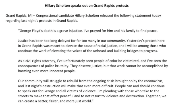 The other post that Scholten made on May 31st, 2020, was a formal statement from here campaign, posted here below: