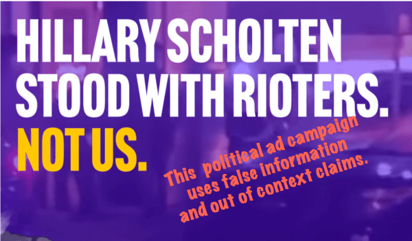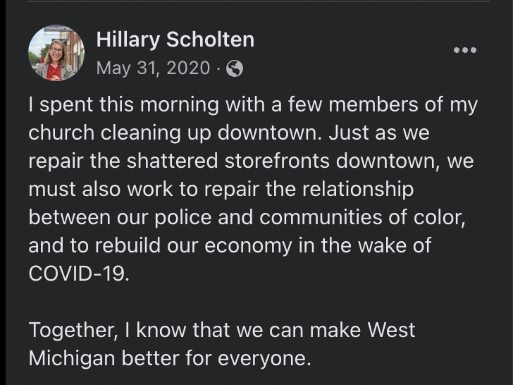 Then comes the punch line, “Hillary Scholten’s response just one day after the riots? She dismissed the destruction and praised the rioters. And Scholten worked with a group that wanted the rioters to get away with destruction. Hillary Scholten is with them, not us.”