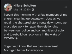 The first claim is supposedly based on comments from Hillary Scholten’s candidate Facebook page for May 31st, 2020. Here is what was actually posted. First, a picture of her and one of her children, sweeping up glass the day after the riot, with the comment you can see here on the right above.