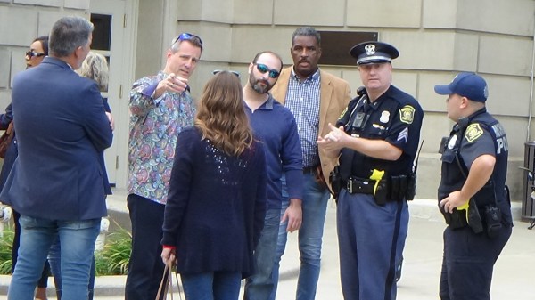 Cosecha is accustomed to engaging in disruptive tactics, so when they left the Capital building, they began to chant along the perimeter of the Christian Right’s rally. The overwhelmingly white crowd did not take kindly to what Cosecha was doing, and tried to prevent Cosecha members from walking anywhere near their event, even going as far as to push some of the female Cosecha participants. This writer was doing crowd safety and was able to get between a white guy and one of the Cosecha organizers, who was now pushing against me. In fact, at one point they went inside to get Capital police to complain about Cosecha and use them to silence the immigrant justice advocates, as you can see here in this picture below.