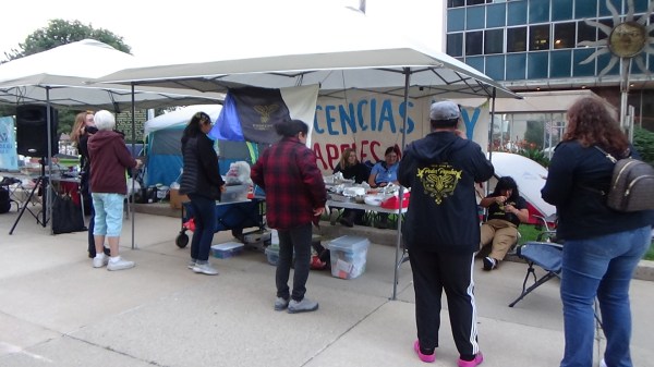 Unwilling to give up, Cosecha Michigan then set up an encampment in front of the Lansing City Hall, which is directly across the street from the Capital. As you can see from the picture below, we were able to set up tents, tables and canopies, just in case it would rain. The Lansing City PD then came, but did not kick us out and said that they would get back to us if the encampment was a problem. The Lansing City PD never called that first night, so we all sat around putting the finishing touches on the encampment, sharing wonderfully cooked food and telling stories. This was Day 1 of the Cosecha protest encampment. We’ll see what Day 2 brings, but Day 1 was filled with hope, passion and a deep commitment to the struggle. La Lucha Sigue y Sigue!