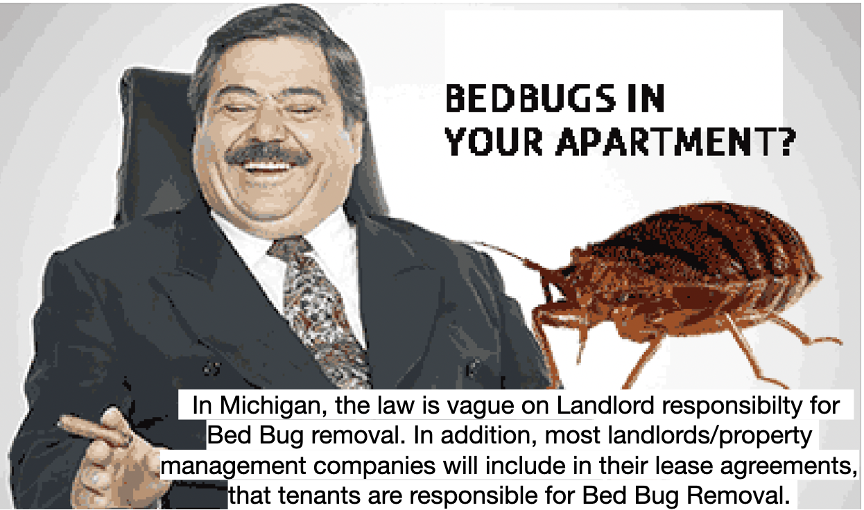Now, there are no concrete laws in Michigan that hold landlords and Property Management Companies responsible for the cost of bed bug infestation. The Michigan Tenant and Landlord Guide, has the following paragraph, which is rather vague language: