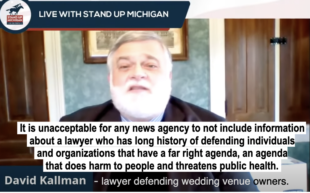 The lawyer representing the wedding venue couple, is David Kallman, with the Kallman Legal Group, something the MLive article failed to mention. In fact, this was not the only omission on the part of MLive, when it came to Kallman, a lawyer who has a history of representing and supporting far right organizations and issues throughout Michigan.