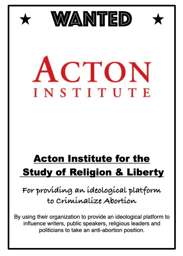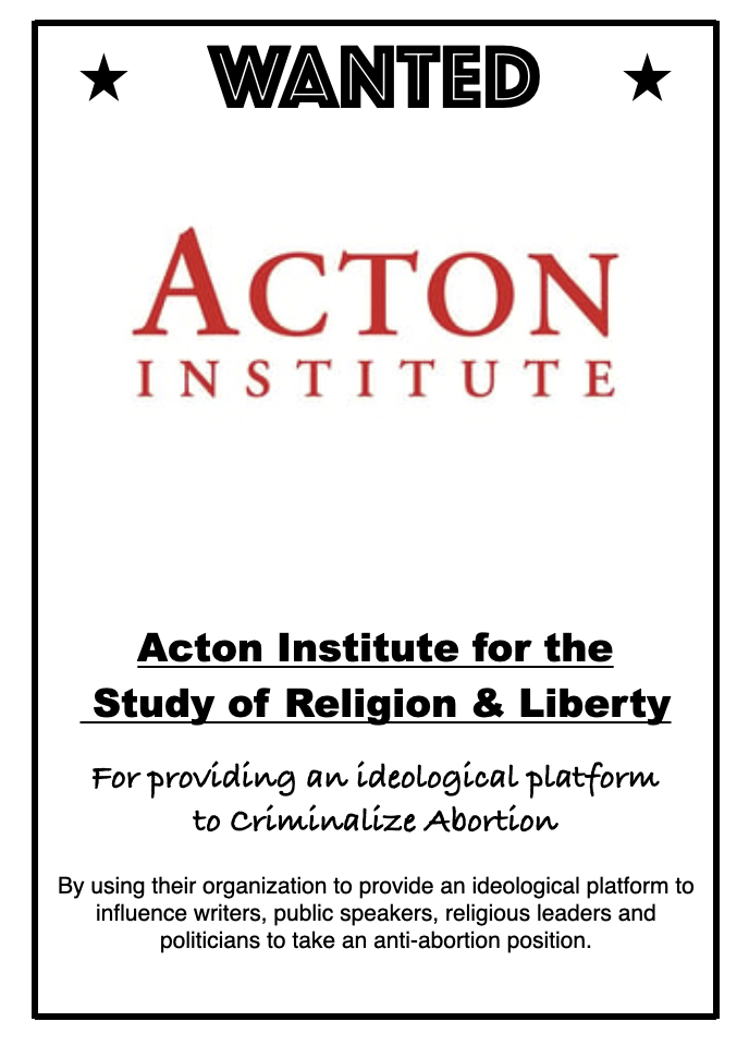 Today’s focus is on the Far Right Think Tank, the Acton Institute for the Study of Religion and Liberty. Unlike some of the other entities that have garnered Wanted Posters, the Acton Institute does not fund anti-abortion groups and they do contributed to anti-abortion candidates. What the Acton Institute does, is provide an ideological framework to individuals, businesses, candidates and organizations who are actively or leaning towards an anti-abortion position.