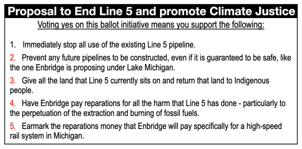 Now, the reason that such a ballot initiative for Climate Justice or the End of Line 5 has not been put on the ballot, is primarily because the two major political parties in Michigan would never endorse such a project. Neither the Republicans nor the Democrats would endorse such a ballot initiative, simply because both parties are too entrenched in the systems of fossil fuel extraction, the system of capitalism, the role of lobbyists and the benefits of maintaining systems of power and oppression.