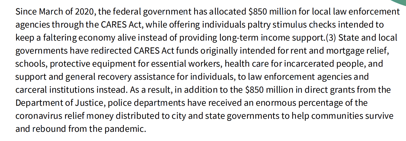 There are several reasons why this proposal should be outright rejected. First, the proposal from the Kent County Sheriff’s Department continues a trend that began in 2020, where local law enforcement agencies have continued to re-direct CARES Act funding away from the public and those who most need it. A May 2021 report from the group Interrupting Criminalization entitled, Divesting from Pandemic Policing and Investing in Just Recovery, provides us with this important analysis:
