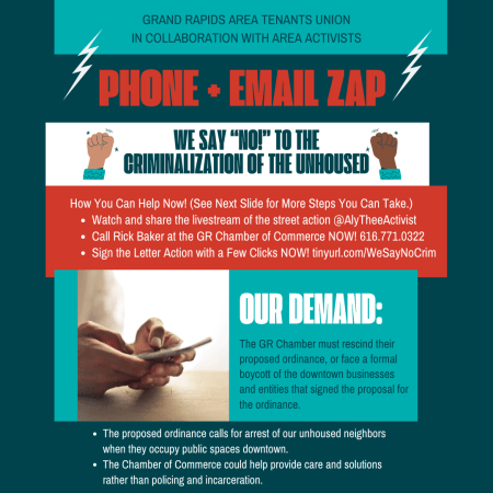 Several local organizers and autonomous groups have resounded to the outlandish GR Chamber proposal. On Monday, about 25 people showed up at the GR Chamber office, demanding that they rescind the letter and make a public apology for putting forth said ordinance proposal. In addition to the protest, people have been calling the Chamber CEO, along with several members of the business community that signed on to the Chamber’s proposal to let them know that if the Chamber doesn’t meet the demands presented to them on Monday, that there would be a call for a boycott of all downtown businesses. Lastly, those involved in resisting the Chamber’s ordinance proposal, created an online letter that is being sent to Grand Rapids City officials, which has been signed by over 10,000 people. I know that most of the 10,000 are not self-designated “community leaders”, but 120 compared to 10,000 should tell you something.