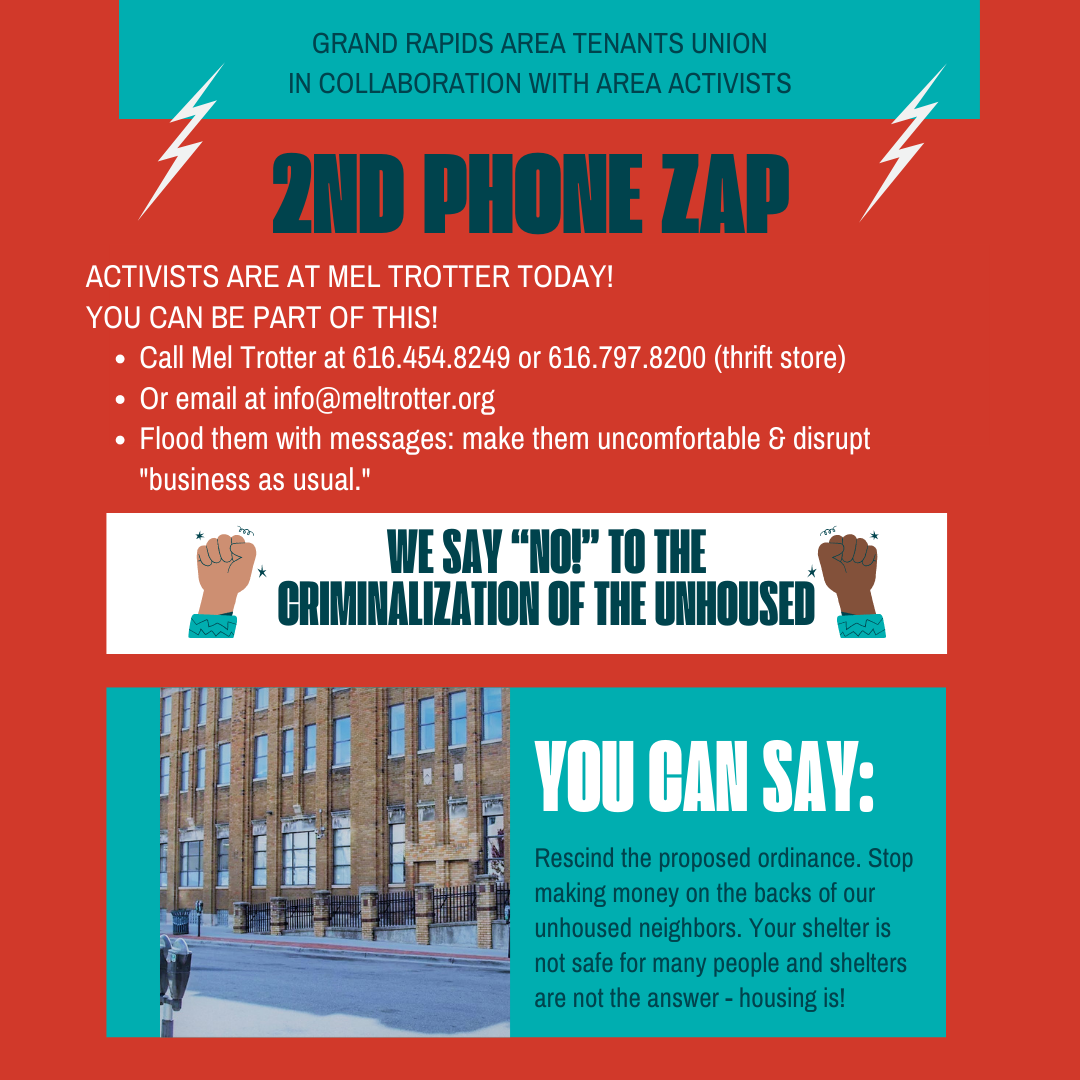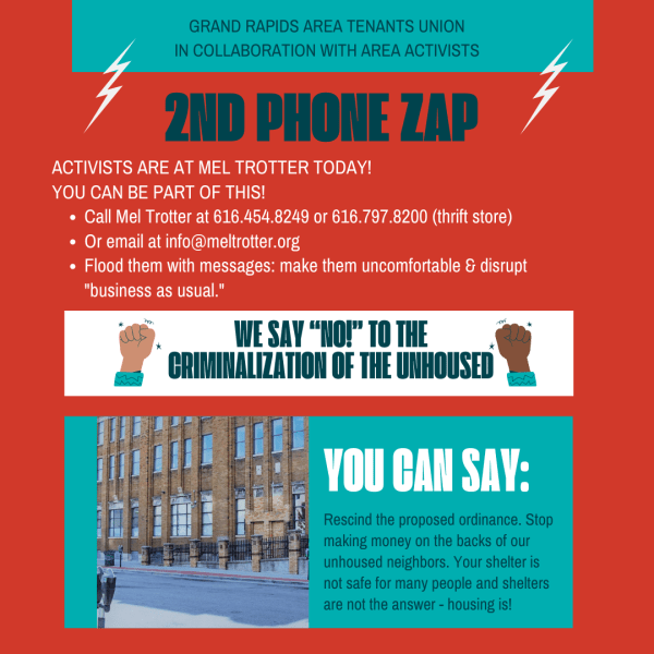 For those who were unable to attend in person, the Grand Rapids Area Tenant Union, which is collaborating with other area activists, are encouraging people to contact Mel Trotter Ministries to demand they pull their support for the proposed ordinance from the GR Chamber of Commerce. Call Mel Trotter at 616.454.8249 or 616.797.8200 (thrift store), or email at info@meltrotter.org. Please share the graphic included in this article so we can get as many people to pressure Mel Trotter Ministries to do the right thing.
