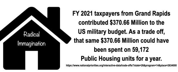 According to the excellent data provided by the National Priorities Project, for FY 2021 taxpayers from Grand Rapids contributed $370.66 Million to the US military budget. As a trade off, that same $370.66 Million could have been spent on 59,172 Public Housing units for a year. Imagine if that amount of money stayed in Grand Rapids and was used for critical issues like housing, education, health care etc. It’s never a question of there not being enough money, rather it is always a question of priorities.