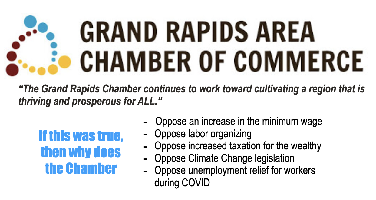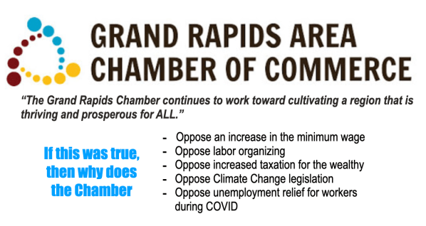 Now, the mission statement of the Grand Rapids Chamber of Commerce states, “The Grand Rapids Chamber continues to work toward cultivating a region that is thriving and prosperous for ALL.” This is an outright lie, especially if one examines the legacy of the GR Chamber and the kind of things they have supported over the decades, which is in step with the US Chamber of Commerce.