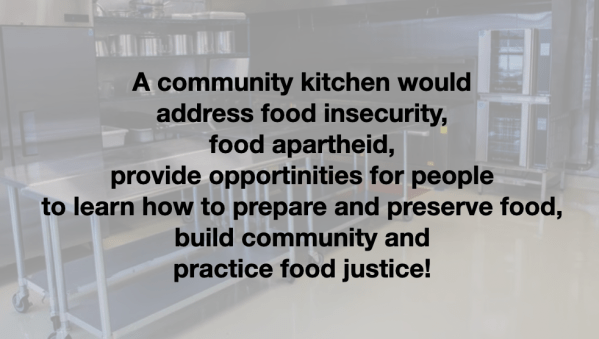A question I would ask about this process that need to the decision to create the “Incubator kitchen” would be, “were there other options presented about address food insecurity in that neighborhood, like the idea of a community kitchen.” A community kitchen is fundamentally different that an Incubator kitchen, since a community kitchen is more of a cooperative model designed to address food insecurity, food apartheid and build community. The function of a community kitchen is to have a collective space that is owned by the community, where people can cook meals together, send food home with families, share recipes, and provide skill sharing like how to preserve and prepare food.