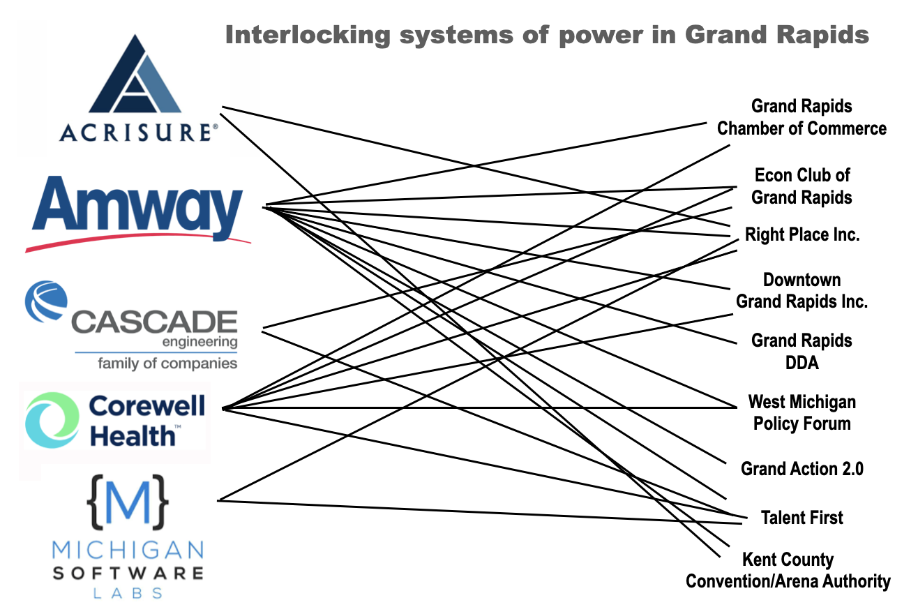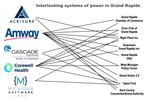 The five companies that are partnering with GVSU are, Acrisure, Amway, Cascade Engineering, Corewell Health and Michigan Software Labs. Now, these aren’t just random companies that will be partnering with GVSU, they are companies that are deeply tied to the Grand Rapids Power Structure, which is essentially an interlocking system of power, as is reflected in the graphic above. For the purposes of this post, we will attach the DeVos name to Amway, since the DeVos family is at the top of the Grand Rapids Power Structure and has dozens of subsidiaries that are represented in the groups that make up the local power structure.
