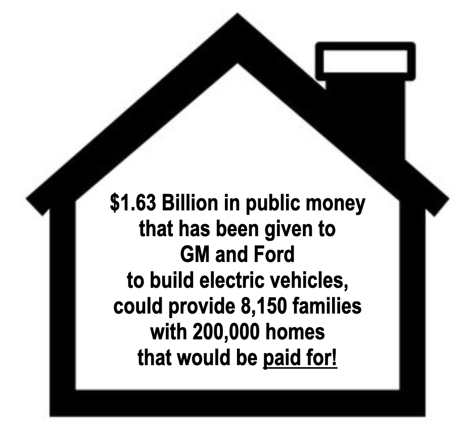 Wouldn’t it be a more direct benefit to people who are housing insecure, to give public money to families to be able to purchase a home. For instance, if we used the $1,630,000,000 in public money that has gone to GM and Ford and gave it to families to purchase say a $200,000 home, which is a moderate cost for a house these days, how many families would be able to buy a house? For the amount of public money given to GM and Ford over the past 12 months, 8,150 families could buy a $200,000 home. This would also mean that these families would have no mortgage, since the house would be paid for and they could then spend money in other areas, which would also stimulate the economy.