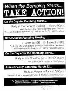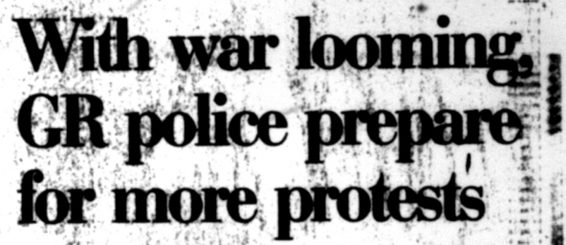 In today’s post, we will look back on some of the plans that anti-war organizers had put in place once the US invasion/occupation of Iraq began. In addition, we will look at the increased surveillance of the GRPD on anti-war organizers and activities prior to the March 20th US bombing campaign against Iraq.