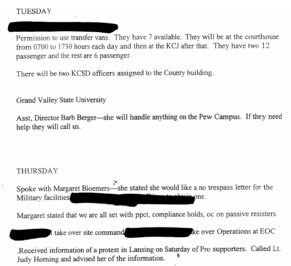 There was also an interesting FOIA document from the GRPD, which included plans to have police vans available, cops assigned to the County building, along with what GVSU security people were planning in case students protested, which you can see here below.