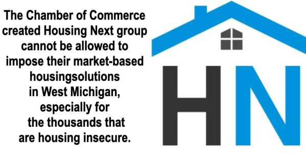 The bottom line is that the Housing Next model is a false solution, since it involves the very same organizations, businesses and individuals that have done everything in their power to promote wealth creation for the business class, while creating a vast array of obstacles for everyone else who lives in West Michigan and cannot afford the cost of housing. Having Housing Next be in charge of hosting community meetings, and providing updates around the current housing crisis in West Michigan will just mean that the same old failed market-based solutions will be implemented and the housing crisis will continue. We cannot let this happen.