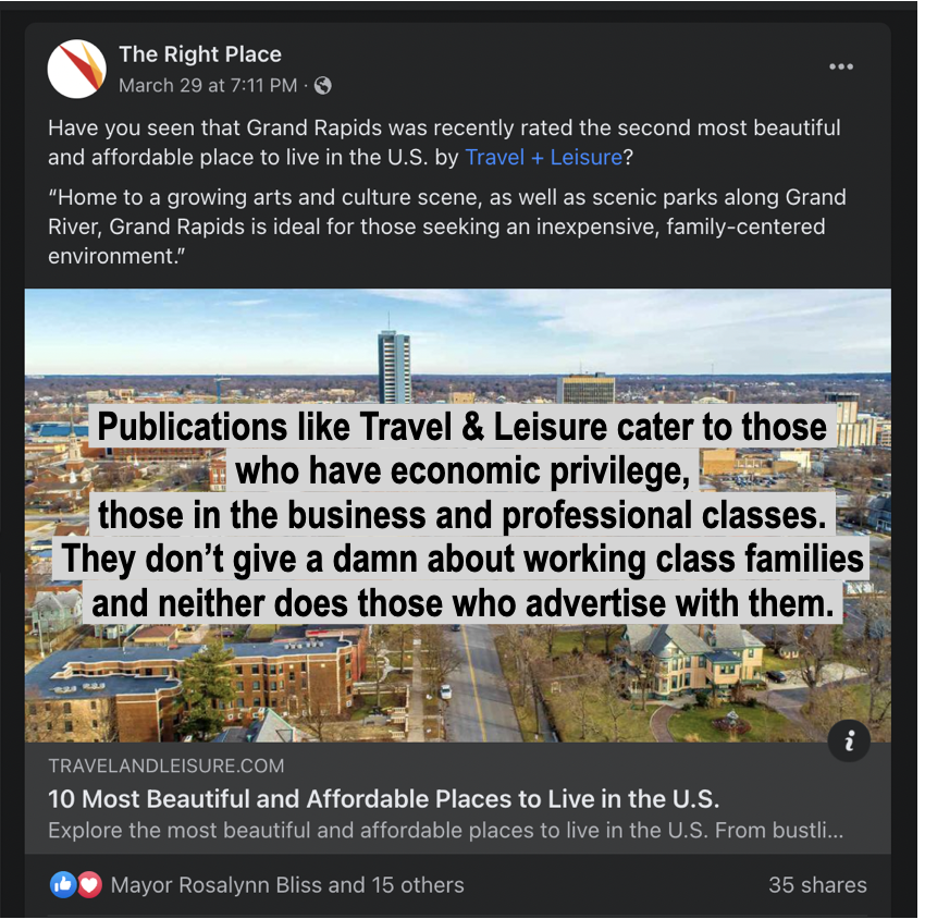 Now, one of the most influential pro-business groups in Grand Rapids, the Right Place Inc., recently shared the Travel & Leisure post about Grand Rapids being the 2nd most beautiful and affordable place to live in the country. Thirty-five people shared that post, including the Mayor of Grand Rapids. However, no matter how many people actually believe these ridiculous rankings about which city is the safest or the most affordable, the reality is that for thousands of people and thousands of families in Grand Rapids, Beer City is NOT affordable.