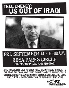 Vice President Dick Cheney came one more time to Grand Rapids, in September of 2007. Cheney spoke at the Gerald R. Ford Museum and another protest was organized by ACTIVATE, with an estimated 75 people participating in the action in the early part of a weekday.