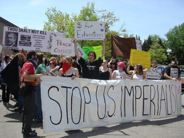 On the day of the Calvin commencement, there were hundreds of people lined up on the East Beltline, protesting Bush’s visit. Several groups were calling for the protest, but the group calling themselves Against Empire was the most organized with large banners (seen here below).