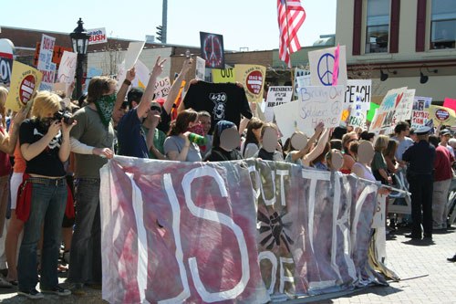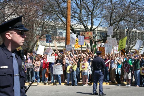 In April of 2007, President Bush came back to the area, this time speaking at the auditorium of East Grand Rapids High School. Former CIA agent Ray McGovern was in town and spoke at an anti-war rally before Bush arrived, only to be greeted by at least 1,000 protestors. There were many people unaffiliated at the demonstration, but it was organized by ACTIVATE, which distributed a 10 Reasons to Oppose the Iraq War flyer. ACTIVATE also had several large banners and attempted to challenge and bypass the police efforts to create “free speech zones.”