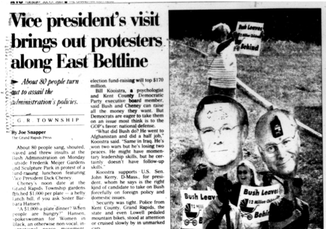 Just before the 4th of July weekend (2003) in Grand Rapids, Vice President Dick Cheney announced that he would be visiting. There were two separate protests, one organized by the People’s Alliance for Justice & Change, focusing more on US war crimes and Cheney’s war profiteering, while the other protest was organized by people involved with the Democratic Party (see image above from the GR Press).