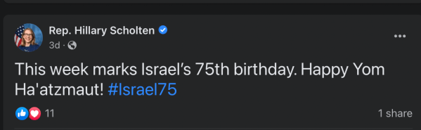 At the other end of the spectrum, newly elected Rep. Hillary Scholten has made no comments about the resolution proposed by Representative Rashida Tlaib, but she did make a Facebook post on April 25th, which read: