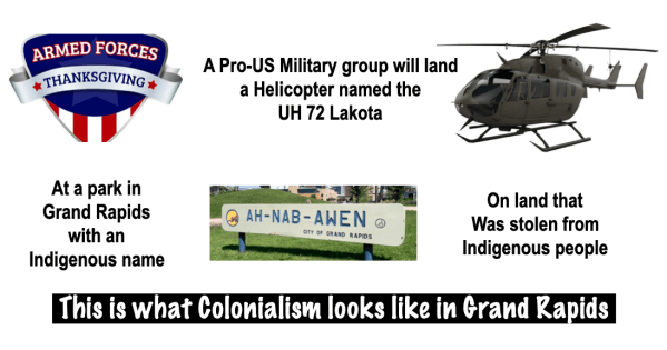 It’s bad enough that the group Armed Forces Thanksgiving has organized this event, but it is even more frustrating and insulting that the City of Grand Rapids has approved this event. Do those at the City of Grand Rapids not see how offensive and insulting this event is to Indigenous sovereignty? Do they not see how this event on May 19th normalizes Settler Colonialism and erases the legacy of conquest by the US Military of Indigenous peoples?