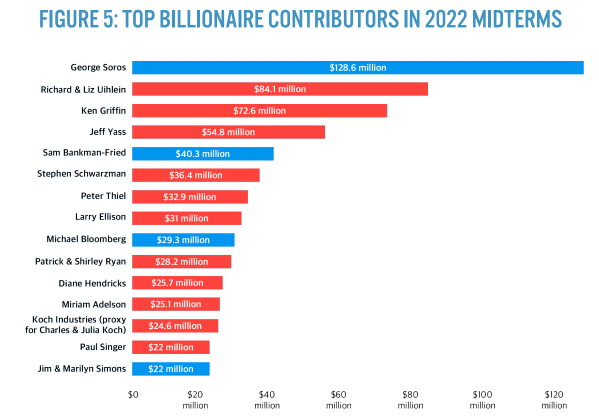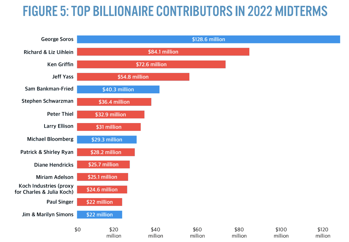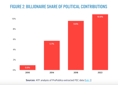 Billionaires have plenty of money with which to try to buy elections, their net worth increased by 58% to a staggering $4.7 trillion during the roughly three years of the pandemic alone. The failure of America’s tax system to fairly tax the income and wealth of billionaires leaves the with lots of excess cash to spend on candidates and causes. Meanwhile, the breakdown of campaign-finance controls since the Supreme Court’s notorious Citizens United decision in 2010 has made it easy for tycoons to translate their economic clout into political power.